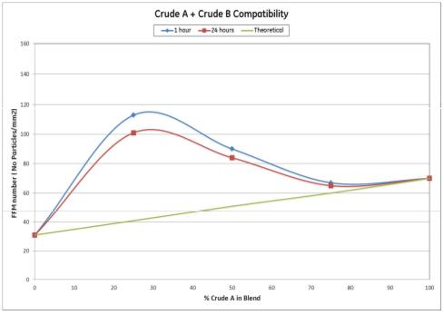 The FFM allows for on-site crude analysis and compatibility studies to predict the relative fouling potentials of the different crudes and crude blends being processed. By blending the crudes in different ratios and measuring the FFM values, incompatibility and instability of the blend due to asphaltene precipitation is easily identified. When no increase in solids is observed, the blend is considered compatible and stable (see Figures 2 and 3).